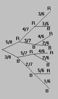 Some students protest that this type of expression will not work in every case and possible problem situations are given; "Not if you have ten trials." "What if we're not looking at all red ones?" This is exactly the lead that Mr. ode is looking for. He takes up the last suggestion. "What if we are looking at two red ones and one blue one in three draws? Let's look at this question next." With the students supplying the details of possible routes through the tree and the probabilities on each branch, Mr. Ode creates a sequence parallel to the development in the first question. This ends in the expression,