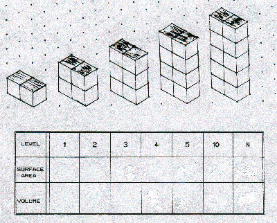 The steps are quickly repeated with the volume results and then the class divides into groups of four that will work on similar activities to build algebraic expressions for block patterns. (JO-LES-D-20b, See Appendix H) (JO-LES-N-20)